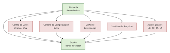 Desde una perspectiva de inteligencia financiera, esta linealidad es una debilidad estructural. Un análisis detallado revela una trayectoria funcional multiescalar que atraviesa de 5 a 7 jurisdicciones distintas en cada operación binaria. Así, una transferencia A → B entre un banco alemán y uno chino implica: i) infraestructura digital; ii) infraestructura física; iii) capas de respaldo satelital; iv) centros de datos en tránsito; y v) marcos legales fragmentados (esquema 1). Así, una línea recta aparente oculta un entramado operativo jurídico, digital y físico que la convierte en un blanco de elevada vulnerabilidad (Grupo Egmont, 2024).