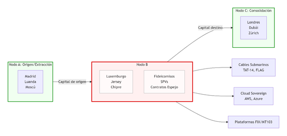 La arquitectura de las transacciones ilícitas de capital financiero no responde a una lógica uniforme, sino a una pluralidad de configuraciones topológicas que estructuran la circulación del capital en función de su función, finalidad y legalidad. Cada flujo es un ensamblaje dinámico de nodos funcionales —origen, legalización, destino, consolidación, custodia, arbitraje— que actúan como estaciones intermedias donde el capital se transforma, se disimula o se acelera. Estos nodos pueden materializarse como jurisdicciones opacas, centros de datos, infraestructuras de trading algorítmico, entidades fiduciarias, bolsas tolerantes o tribunales arbitrales, configurando una malla de vectores geoeconómicos y geojurídicos.