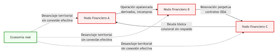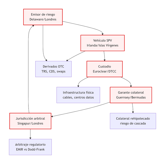 En términos espaciales, se sostienen sobre una infraestructura física y digital altamente fragmentada en múltiples jurisdicciones. Contratos y registros se almacenan en nubes híbridas con cifrado parcial, disociando ubicación física y jurisdicción legal. Los registros se actualizan mediante APIs bancarias sin integración AML, y los flujos se canalizan por redes SWIFT o FIX sin correspondencia territorial verificable.