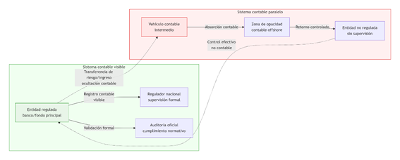 Desde una perspectiva de seguridad financiera, los riesgos son graves: la desconsolidación estructural impide que los balances reflejen las exposiciones reales, ocultando vínculos clave entre entidades. Existe una transparencia ilusoria, donde las firmas cumplen formalmente con normativas locales mientras operan estructuras paralelas fuera de auditoría. Además, se produce una captura contable, trasladando riesgos y resultados a vehículos sin supervisión efectiva, debilitando el control institucional (Gorton, 2007; FMI, 2014). La respuesta requiere penetración semántica forense, auditoría cruzada de redes fiduciarias y análisis topológico inverso de consolidaciones ocultas. Los flujos de ocultación contable no son sólo mecanismos de elusión, constituyen una estructura paralela clave en la arquitectura del capital del siglo XXI (esquema 8).