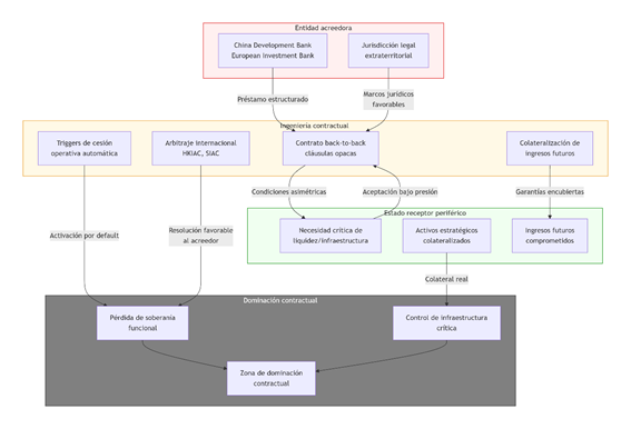 El esquema operativo parte de un nodo acreedor ofrece un préstamo estructurado bajo una jurisdicción legal favorable al acreedor. El nodo deudor, con baja capacidad de negociación y necesidades críticas de liquidez o infraestructura, acepta términos contractuales opacos con cláusulas de activación asimétricas y garantías encubiertas. A diferencia de los préstamos multilaterales estandarizados, estos contratos bilateralizados no están sujetos a transparencia parlamentaria, supervisión internacional ni auditoría ex ante (esquema 10).
