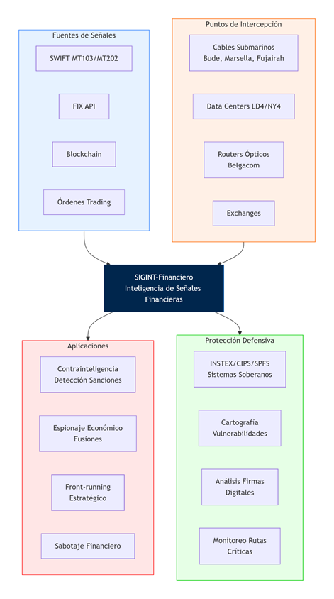 La inteligencia de señales aplicada a redes financieras constituye un nuevo campo operativo donde confluyen la vigilancia electrónica, el espionaje económico y la arquitectura técnica del sistema financiero global. A diferencia de la inteligencia tradicional basada en personas (HUMINT) o fuentes abiertas (OSINT), el SIGINT-financiero explota la infraestructura físico-digital por donde circulan las órdenes de pago, los contratos y las transferencias de activos.