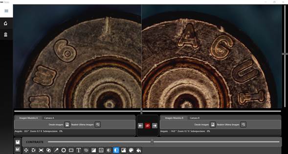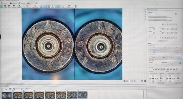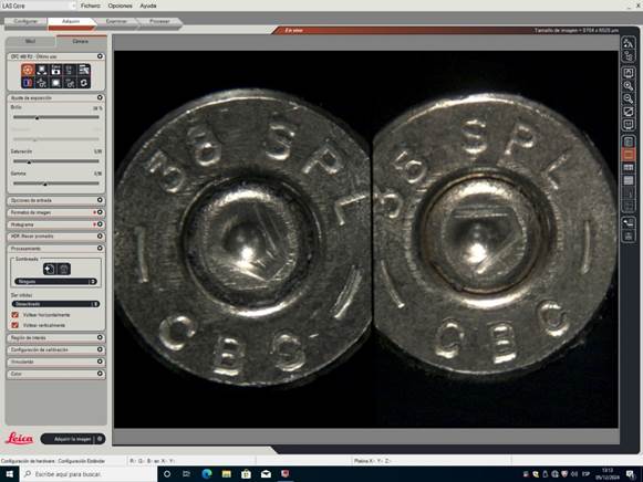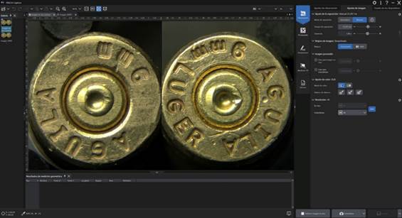 Fotografía de comparación de culote de casquillos del sistema del microscopio LeicaMR, donde se aprecian sus funciones generales en las pestañas superiores y en el costado derecho e izquierdo de la pantalla.
