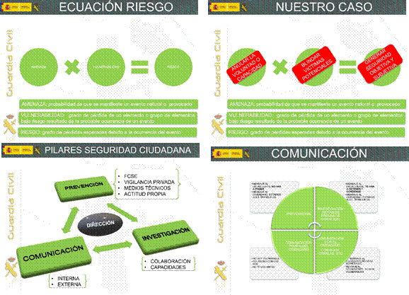 La teoría de los 3 pilares fue ampliamente difundida a nivel interno con ocasión de las reuniones de coordinación entre mandos, revistas y en vigilancias de servicio y, a nivel externo, en juntas de seguridad, reuniones trimestrales con comerciantes y gremio agrario, entrevistas de medios de comunicación, directores de los centros educativos, judicatura, etc.